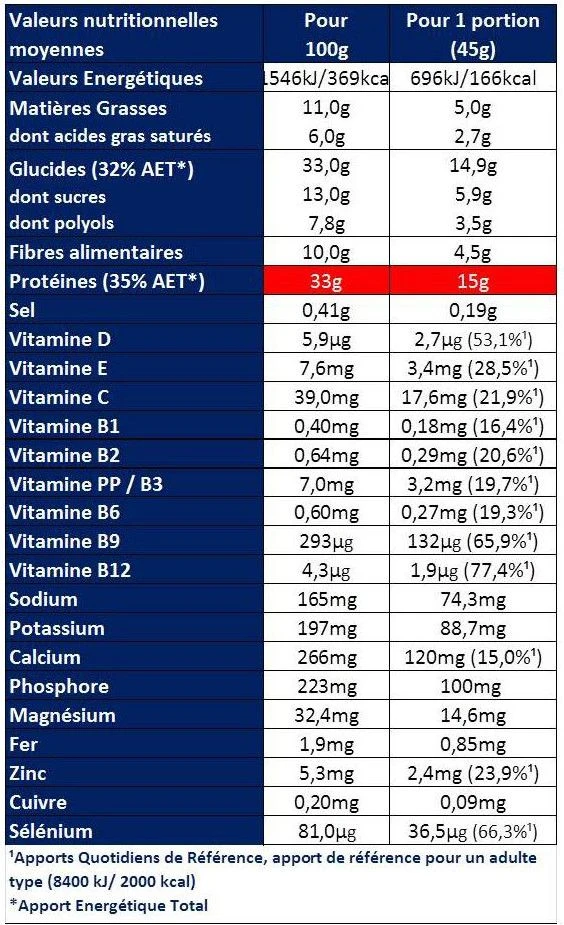 Soy Extracts 37% (soy protein isolate, tapioca starch, rice flour, barley malt extract, salt), oligofructose syrup, milk couverture chocolate 15% (sugar, cocoa butter, powder whole milk, cocoa mass, emulsifier: soy lecithin, natural vanilla flavor), stabilizers: glycerin and acacia fiber, wheat proteins, rapeseed oil, roasted hazelnuts 3.4%, milk proteins, cocoa powder 2.1% maltodextrin, emulsifier: soy lecithin, vitamins (C, B3, E, B2, B6, B1, B9, D3, B12) wheat, minerals (zinc, selenium) wheat.