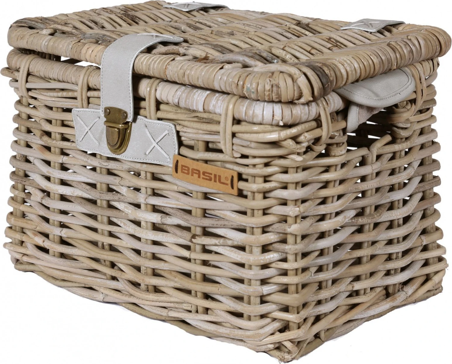 The Basil Denton M is a luxurious storage box designed to fit the front of your bike. This rattan bike basket is available in a classic gray color and features leatherette trim.