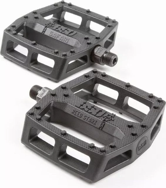 Reed has been talking about this pedal idea for as long as he’s been on BSD. He noticed that when a bike falls to the ground, the corner pins on plastic pedals grind and break off. The Safari pedal is designed with extra pins in these high impact areas to ensure the pedal stays grippy after withstanding severe abuse. The optimal pin placement, hexagonal pin shape, and knurling all combine to make this one of the most durable, effective plastic pedals in the market.