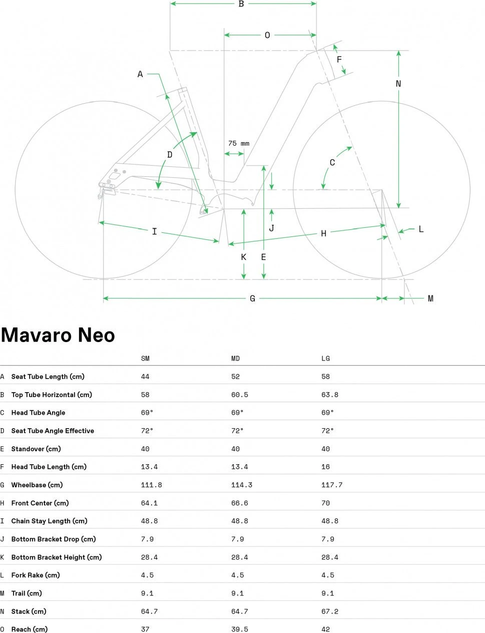| Frame | Mavaro Neo Si SmartForm C1 Alloy step-thru frame, removable downtube battery, fully internal cable routing, 135x9mm sliding dropout, post mount disc, headtube waterbottle mounts, integrated daytime running light, HDT child seat / cargo mount compatible |
