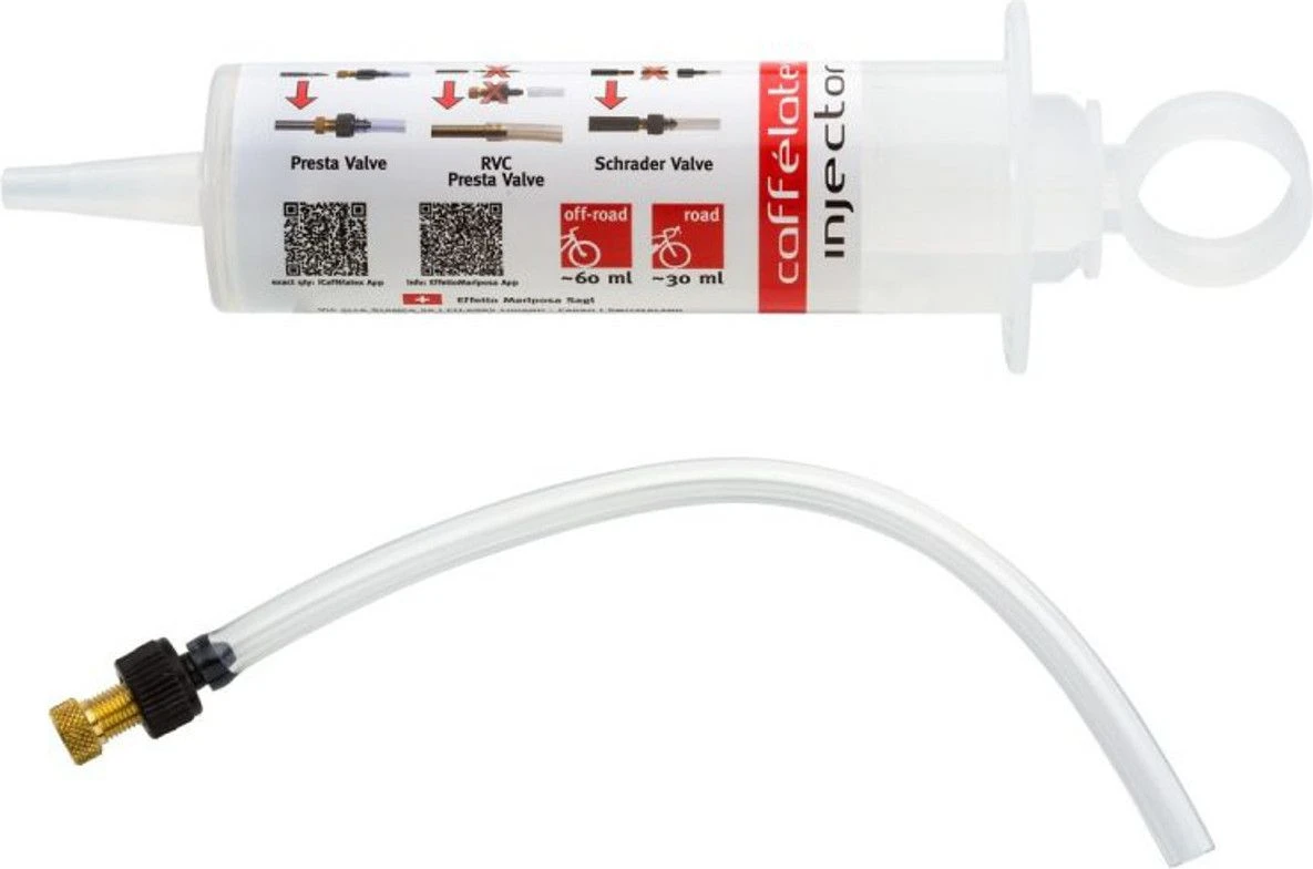 Caffélatex Injector injects sealants through the valve, in a controlled, fast and clean way. It works for both Presta (removing or not the valve-core) and Schrader valves, and comes with a long tube for easier operation.