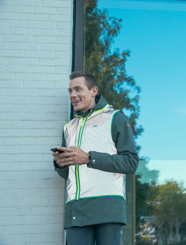 Fully reflective with contrasting stripes and a pocket in the side seam.