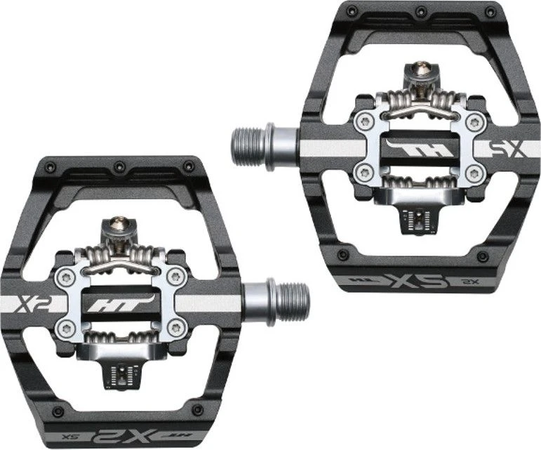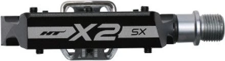 The HT Components X2 SX clipless pedals are high-end BMX racing pedals with low profile platforms that are extruded and CNC machined from aluminum, chromoly spindles and 5 removable pins per side for additional grip. The X2 SX pedals have dual sided entry/release with adjustable spring tension, HT’s EVO bearing system that uses both needle bearings and a bushing for smooth and reliable operation, and HT’s exclusive SX pedal upgrade kit that greatly reduces the risk of unintentionally clipping out while racing.