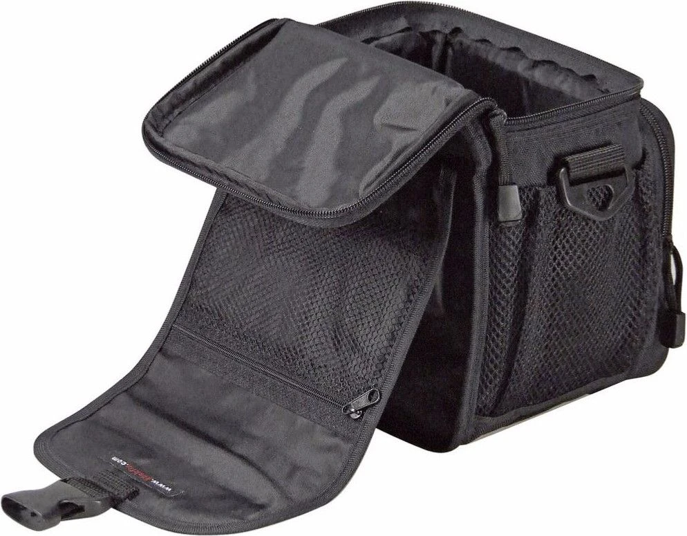 Compact, well-organized bag. With handle, detachable shoulder strap, main and front compartment with 2-way zipper, net compartments on both sides. Comes with separate rain cover and KLICKfix handlebar adapter. Thanks to its slim shape, this bag can also be used on strongly curved handlebars.