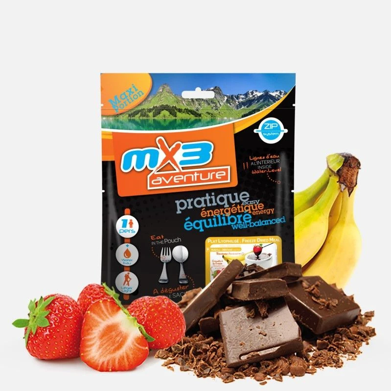 The chocolate fondue and its freeze-dried fruit crousty is a delicious freeze-dried dessert made with cocoa and crispy fruits (banana and strawberry) to finish off an energetic meal.