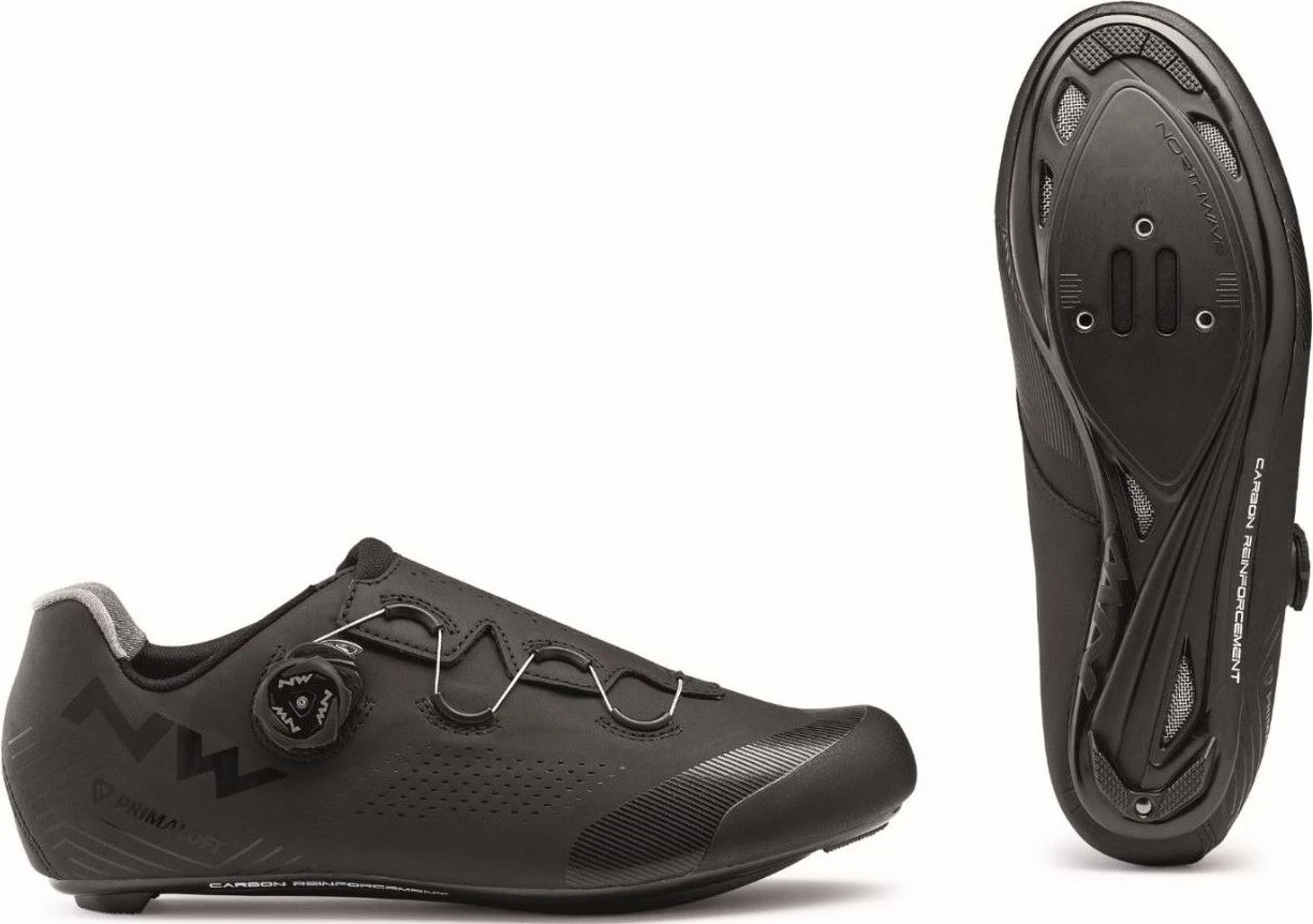 Power transmission is provided by the NGR Air Carbon Reinforced sole with a stiffness index of 8.0 . The overlap construction made with the most innovative materials wraps the foot evenly, without any pressure points, helping to transfer every watt of power while eliminating energy dispersion. The toe is reinforced with TPU and the closure system is comfortable and guarantees a uniform fit thanks to the SLW2 dial, the only one with step-by-step release.