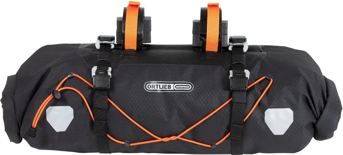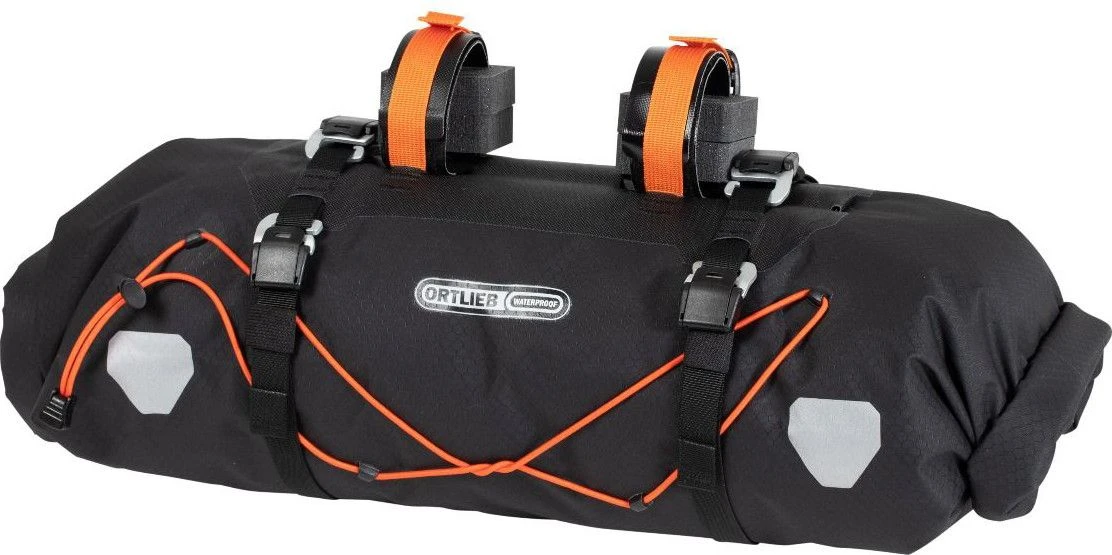 The waterproof Ortlieb Handlebar-Pack is an indispensable item when you’re on a bikepacking tour in the great outdoors. The Handlebar-Pack offers a payload of 15 liters for your sleeping bag and pad. It also helps to secure a balanced distribution of gear and weight across your bike. Thanks to the roll closures at both ends, you can always gain quick access to your gear. Compression belts on the outside enable the stowing and attachment of additional equipment. Moreover, the Handlebar-Pack comes with four hooks to enable the attachment of an Ortlieb Accessory-Pack for additional stowage space. Consisting of spacers and two strong Velcro straps, the mounting system ensures secure attachment to any handlebar type, including carbon handlebars. The pack’s stiffened interior and head-tube attachment offer additional stability – in any terrain.