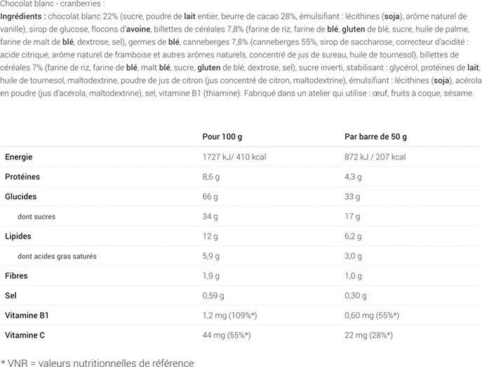 Ingredients: white chocolate 22% (sugar, whole milk powder, cocoa butter 28%, emulsifier: lecithins (soya), natural vanilla flavouring), glucose syrup, oat flakes, cereal billets (rice flour, wheat flour, palm oil, wheat gluten, sucrose, wheat malt, dextrose, salt), wheat germ , cranberries 7.8% (cranberries 55%, sucrose syrup, acidity corrector: citric acid, natural raspberry flavouring and other natural flavourings, elderflower juice concentrate, sunflower oil), crunchy mix (rice flour, wheat flour, malt wheat, sucrose, wheat gluten, wheat dextrose, salt), inverted sugar, stabiliser: glycerol, milk proteins, sunflower oil, maltodextrin, lemon juice powder (concentrated lemon juice (dry extract 40%), maltodextrin), emulsifier: lecithins (soya), flavouring, acerola (acerola juice, maltodextrin), salt, vitamin B1 (thiamin). Made in a factory that uses: egg, nuts, sesame.