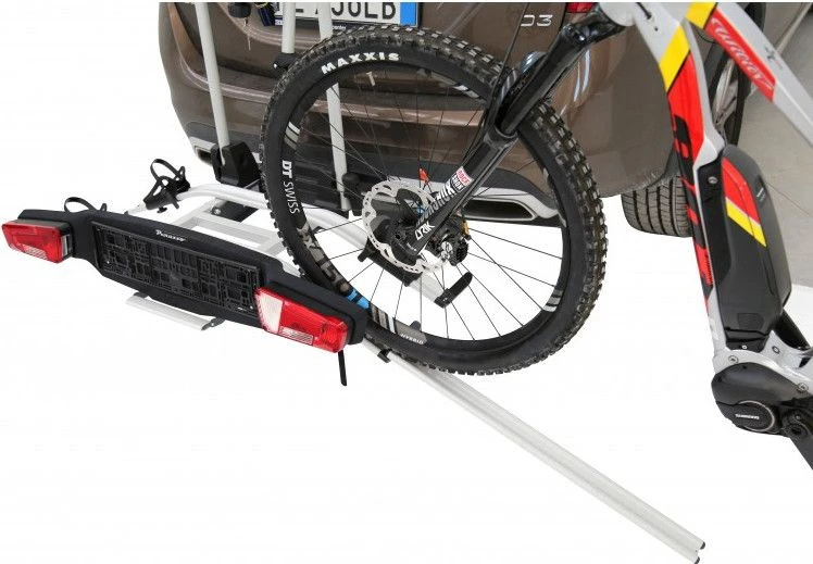 It mounts on a hitch ball and attaches to the frame and rear wheel of the bike. It is equipped with an anti-theft system on each arm. Its access ramp makes it easy to mount electric bikes. It is easily tilted thanks to a large pedal.