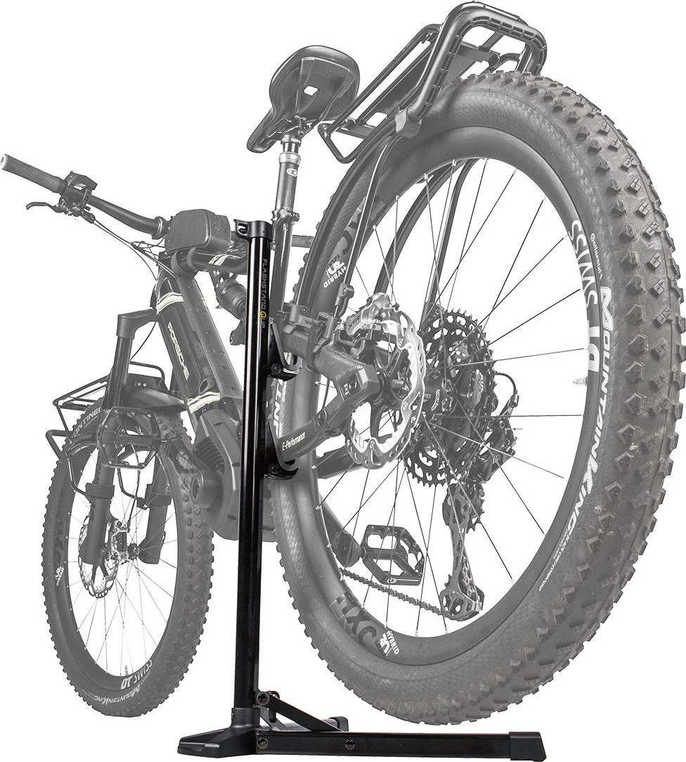 The FlashStand eUP is a stable and portable bike stand for storing and maintaining drivetrain. QR levers speed positioning of frame hooks to fit seatstays / chainstays. Non-marring rubber frame hooks won’t harm bike’s finish and the stronger, larger base adds stability that’s perfect for e-Bikes, heavy weight bikes, and larger bike frames.