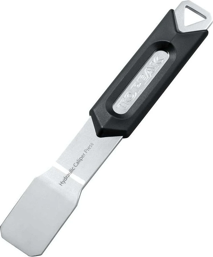 Hardened steel caliper pressing tool to push back pistons when replacing/aligning pads or bleeding hydraulic brake systems. Long padded handle for better leverage and comfortable use.