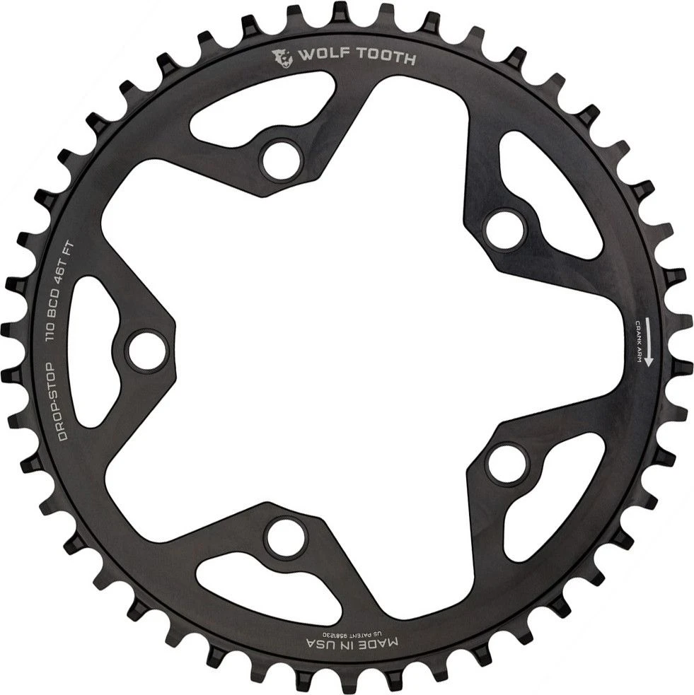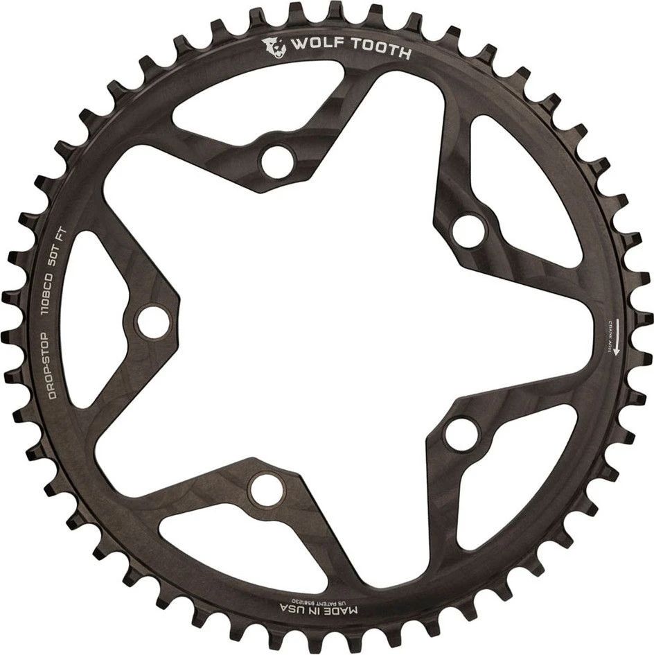 - Drop-Stop technology. On Wolf Tooth’s patented wide/narrow chainring, the wide side of the tooth has maximum contact on the drive side which spreads the load and improves chainring life. The narrow side allows clearance for mud and debris which reduces friction.